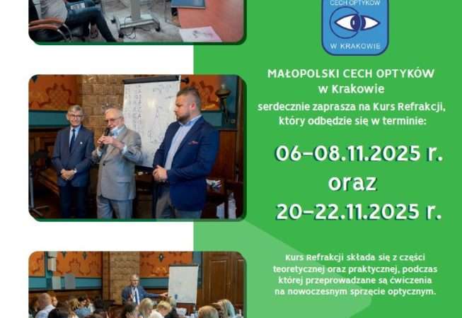 Serdecznie zapraszamy Państwa do organizowanych przez Małopolski Cech Optyków w Krakowie Kursów Refrakcji… Kurs składa się części teoretycznej oraz praktycznej podczas której przeprowadzane są ćwiczenia na nowoczesnym sprzęcie optycznym. Kurs odbędzie się w terminie 6-8 listopad oraz 20-22 listopad 2025r. Serdecznie zapraszamy.