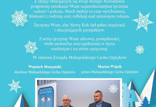 Wszystkim CZŁONKOM Małopolskiego Cechu Optyków z siedzibą w Krakowie, Organizacjom zaprzyjaźnionym oraz naszym Przyjaciołom składamy najserdeczniejsze Życzenia Świąteczne: MNÓSTWO MIŁOŚCI, ale przede wszystkim Dużo Zdrowia, a ponadto też więcej CZASU jakże potrzebnego w tych trudnych czasach przepełnionych pędem a nieraz i szaleństwem
